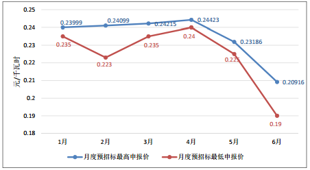 總體來看,月度預招標電廠報價隨發(fā)電意愿的變化而變化,枯平期價格高,電廠普遍增發(fā)能力不足,大部分電廠選擇申報較高的價格以獲得較高收益;隨著汛期的逐步來臨,電廠發(fā)電能力充足,“以量換價”意愿強烈,希望通過降低預招標價格獲得更多的發(fā)電空間。