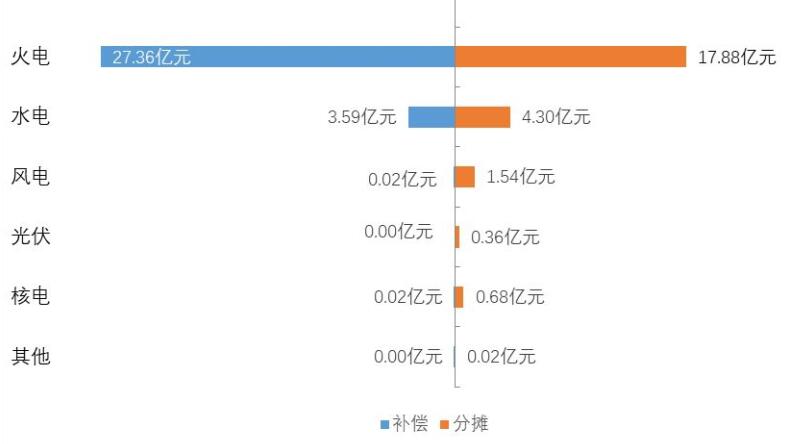 從能源類型的角度來看,電力輔助服務(wù)補(bǔ)償費(fèi)用的補(bǔ)償與分?jǐn)傎M(fèi)用對比如下。(見圖 5)。
