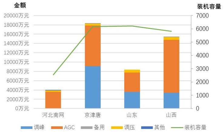 圖 7 華北區(qū)域分省(地區(qū))電力輔助服務(wù)補(bǔ)償分項費(fèi)用情況