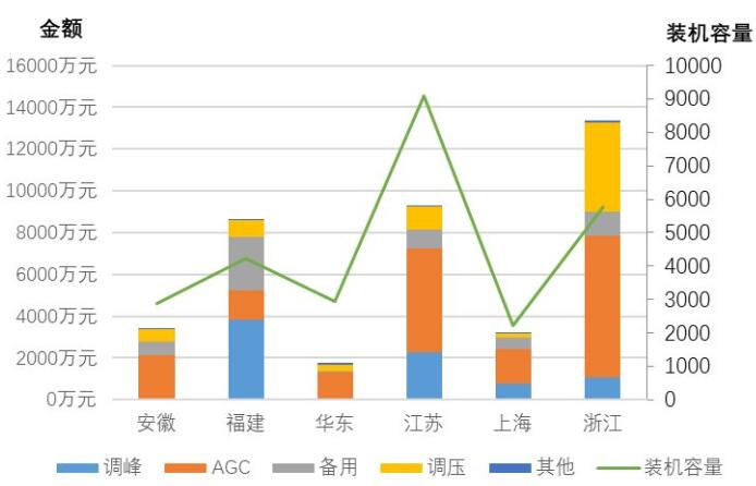 圖10 華東區(qū)域分省(市、區(qū)域)電力輔助服務補償分項費用情況