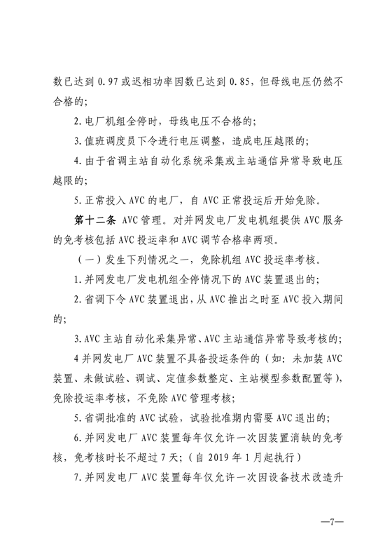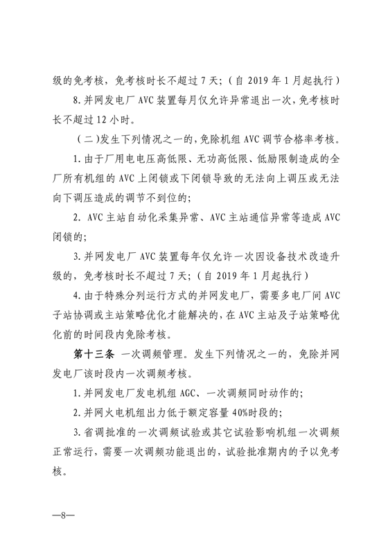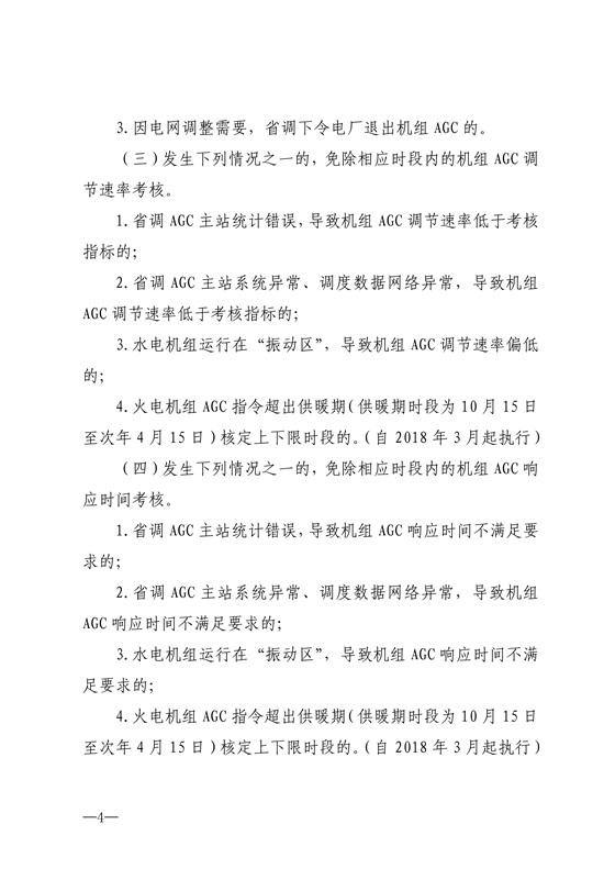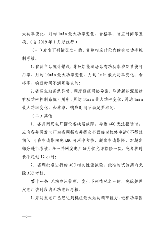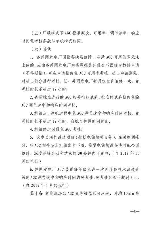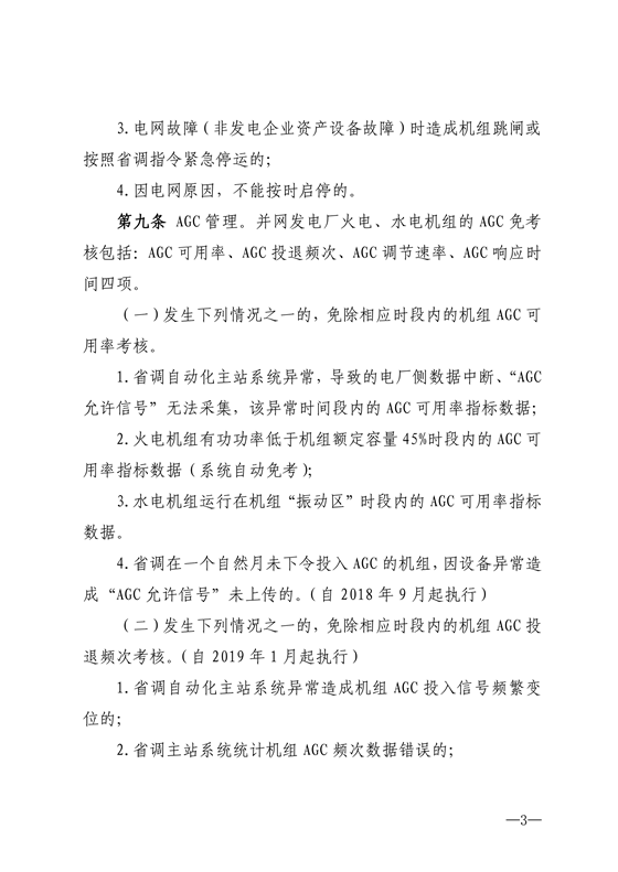 第九條 AGC管理。并網(wǎng)發(fā)電廠火電、水電機組的AGC免考核包括:AGC可用率、AGC投退頻次、AGC調(diào)節(jié)速率、AGC響應(yīng)時間四項。
