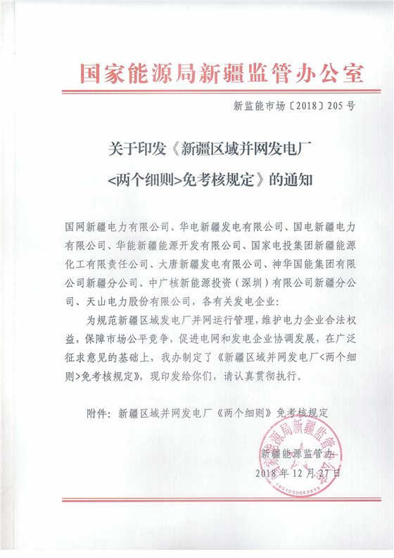 國家能源局新疆監(jiān)管辦公室制定和發(fā)布了《新疆區(qū)域并網(wǎng)發(fā)電廠《兩個細(xì)則》免考核規(guī)定》