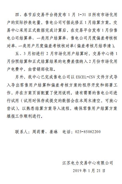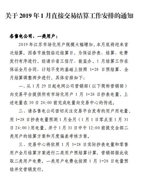 江蘇電力交易中心發(fā)布了《關(guān)于2019年1月直接交易結(jié)算工作安排的通知》