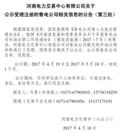 河南電力交易中心今天發(fā)布了關(guān)于公示受理注冊(cè)的售電公司相關(guān)信息的公告(第三批),此次新公示9家售電公司,詳情如下: