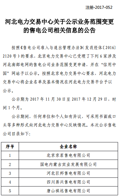 河北《關(guān)于公示業(yè)務(wù)范圍變更的售電公司相關(guān)信息的公告》 6家售電公司業(yè)務(wù)范圍變更