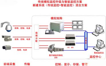 解決方案二:對(duì)于傳統(tǒng)模擬監(jiān)控(已建或新建),選擇重點(diǎn)、高危監(jiān)控目標(biāo)和場所,針對(duì)此部分圖像進(jìn)行分析功能,主動(dòng)監(jiān)控,將預(yù)警、警情實(shí)時(shí)發(fā)給模擬矩陣和DVR,完成快速切換和錄像,選擇智能分析硬盤錄像機(jī),解決方案如圖所示: