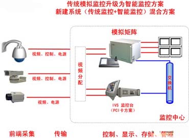 解決方案一:對(duì)于傳統(tǒng)模擬監(jiān)控(已建或新建),選擇重點(diǎn)、高危監(jiān)控目標(biāo)和場所,針對(duì)此部分圖像進(jìn)行分析功能,主動(dòng)監(jiān)控,將預(yù)警、警情實(shí)時(shí)發(fā)給模擬矩陣和DVR,完成快速切換和錄像,選擇智能視頻服務(wù)器(IVS BOX),解決方案如圖所示:
