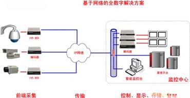 解決方案三、對(duì)于網(wǎng)絡(luò)的數(shù)字化監(jiān)控系統(tǒng),同樣選擇重點(diǎn)、高危監(jiān)控目標(biāo)和場所,直接在前端選擇智能視頻服務(wù)器(IVS BOX),主動(dòng)監(jiān)控,將預(yù)警、警情實(shí)時(shí)發(fā)給后端管理平臺(tái),完成快速切換和錄像,解決方案如圖所示: