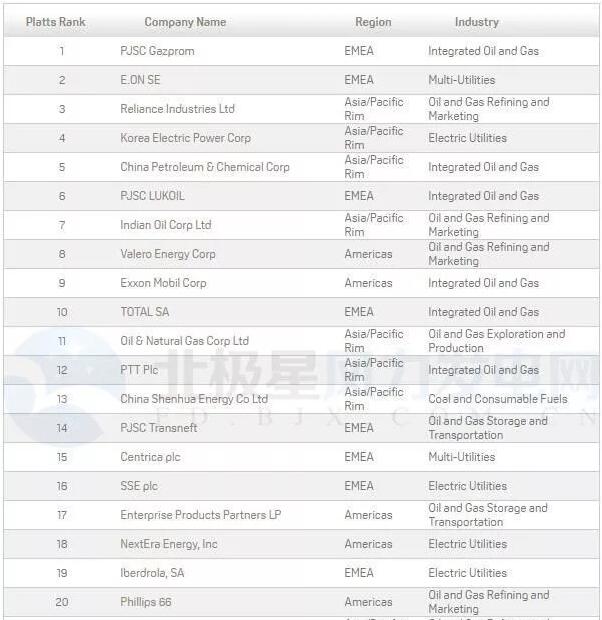 普氏全球能源公司Top 250榜單: