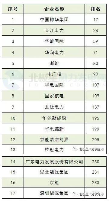 在本次榜單中,俄氣排在榜單第一位,國際風電開發(fā)商NextEra Energy、Iberdrola分列第18位和第19位。中國風電開發(fā)商或有風電業(yè)務企業(yè)有17家上榜,其中神華集團、長江電力躋身前50強分列第17位、第28位,龍源電力排在第137位。具體排名如下:
