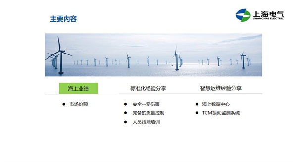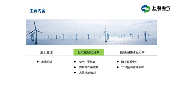 10月17日,北京國(guó)際風(fēng)能大會(huì)暨展覽會(huì)(CWP2017)在中國(guó)國(guó)際展覽中心(新館)隆重召開。展會(huì)期間,上海電氣舉辦了風(fēng)電技術(shù)論壇,上海電氣風(fēng)電集團(tuán)海上區(qū)域經(jīng)理梁文德主題分享《上海電氣標(biāo)準(zhǔn)化、智慧化海上運(yùn)維經(jīng)驗(yàn)分享》,梁文德表示,增加風(fēng)電量,減少投入是運(yùn)維供應(yīng)商的主要任務(wù)。如何將運(yùn)維做到標(biāo)準(zhǔn)化、做到精益化,減少浪費(fèi),該演講從三個(gè)方面給大家做了介紹:第一目前上海電氣風(fēng)電集團(tuán)的海上業(yè)績(jī),第二是上海電氣風(fēng)電積碳的標(biāo)準(zhǔn)化經(jīng)驗(yàn)分享,第三是智慧運(yùn)維的經(jīng)驗(yàn)分享。