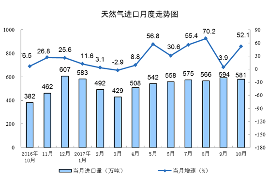 天然氣進口快速增長。10月份,進口天然氣581萬噸,同比增長52.1%,增速比9月份加快48.2個百分點。1-10月份,進口天然氣5416萬噸,同比增長24.9%。