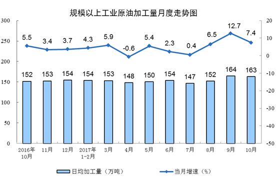 原油加工量增速回落。受去年同期基數(shù)高及成品油批發(fā)價格同比增幅比9月份回落等因素影響,10月份,原油加工量同比增長7.4%,增速比9月份回落5.3個百分點;日均加工量162.9萬噸,比9月份減少1.5萬噸。與9月份相比,主要成品油產(chǎn)量同比增速均回落,汽油、煤油和柴油分別回落9.0、8.7和5.6個百分點。1-10月份,原油加工量4.7億噸,同比增長5.0%。