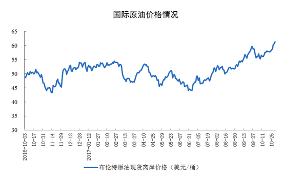 原油價格持續(xù)回升。10月份,布倫特原油現(xiàn)貨離岸價格穩(wěn)定在55美元/桶以上。截至10月31日,價格為61.4美元/桶,比9月底上漲4.3美元/桶。