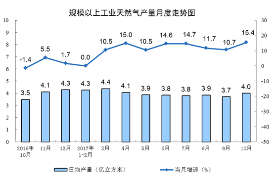 隨著“煤改氣”等工程的推進,天然氣需求旺盛,今年以來產(chǎn)量一直保持快速增長。10月份,天然氣產(chǎn)量124.1億立方米,同比增長15.4%,增速比9月份加快4.7個百分點;日均生產(chǎn)4.0億立方米,比9月份增加0.3億立方米。1-10月份,天然氣產(chǎn)量1211.2億立方米,同比增長9.7%。