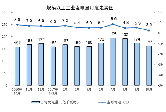 11月14日,國家統(tǒng)計局發(fā)布了2017年10月份能源生產(chǎn)情況。10月份,規(guī)模以上工業(yè)原煤和電力生產(chǎn)增速放緩,原油生產(chǎn)降幅收窄,原油加工量增速回落,天然氣生產(chǎn)保持較快增長。10月份,發(fā)電量5038 1億千瓦時,同比增長
