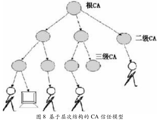 根CA具有一個自簽名的證書,根CA依次對它下面的CA進行簽名,層次結(jié)構(gòu)中葉子節(jié)點上的CA用于對安全個體進行簽名。對于個體而言,它需要信任根CA,中間的CA可以不必關(guān)心(透明的);同時它的證書是由底層的CA簽發(fā)的,沿著層次樹往上找,可以構(gòu)成一條證書鏈,直到根證書。縱向加密裝置CA系統(tǒng)的部署拓撲圖如圖9所示。
