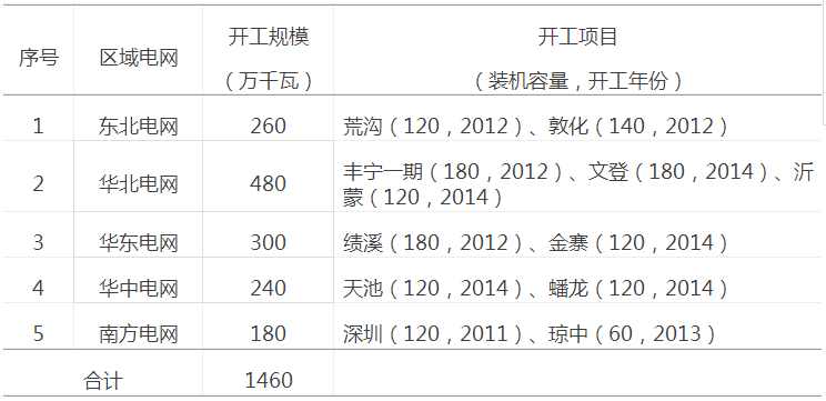 "十二五"期間,抽水蓄能電站核準(zhǔn)開工規(guī)模呈現(xiàn)明顯增長趨勢。"十二五"前四年,累計開工11座電站,總規(guī)模1460萬千瓦。特別是2014年,核準(zhǔn)開工抽水蓄能電站5座,規(guī)模660萬千瓦,創(chuàng)歷史新高。從分布來看,"十二五"前四年開工的蓄能電站主要分布在華北、華東、華中和東北電網(wǎng),南方電網(wǎng)相對較少。