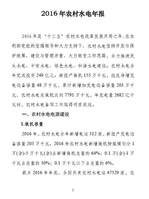 近日中華人民共和國水利部發(fā)布《2016 年農(nóng)村水電年報》,年報指出,2016年農(nóng)村水電全年完成投資249 億元。新投產(chǎn)裝機155 萬千瓦,技改凈增發(fā)電設(shè)備容量48 萬千瓦,累計新增加發(fā)電設(shè)備容量203 萬千瓦,農(nóng)村水
