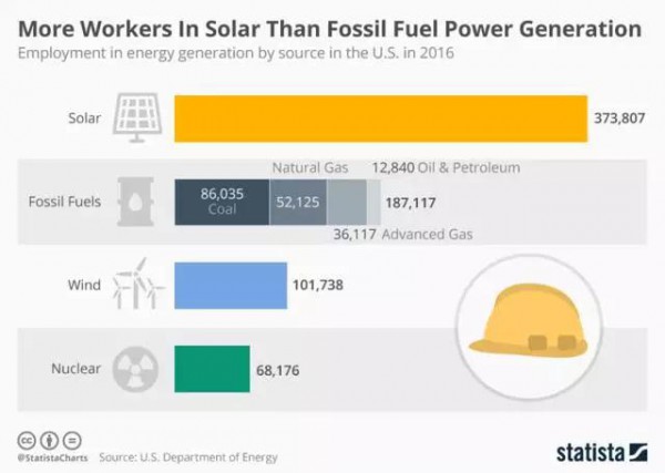 據(jù)美國能源部在今年年初發(fā)布的《美國能源就業(yè)報告》中的數(shù)據(jù)顯示,2016年美國的發(fā)電行業(yè)中,從事光伏發(fā)電的雇員達(dá)到了約37.4萬人,超過了化石能源發(fā)電、風(fēng)電和核電從業(yè)人員總和,占到了發(fā)電行業(yè)總從業(yè)人員數(shù)量的51%。而與之形成鮮明對比的是,2016年光伏電站的發(fā)電量卻只占到了所有類型電站發(fā)電量的0.9%。
