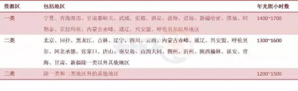 由于光資源的不持續(xù)性造成了光伏發(fā)電的利用小時數(shù)遠(yuǎn)低于火力發(fā)電。據(jù)統(tǒng)計,2016年中國的火電平均利用小時數(shù)為4165小時,而2016年全國光伏利用小時數(shù)最高的省份內(nèi)蒙古只達(dá)到了1662小時,重點省份中新疆只有910小時。我國按照不同地區(qū)光資源的自然條件劃分了三類光資源區(qū)。其年平均光照小時數(shù)如下表:
