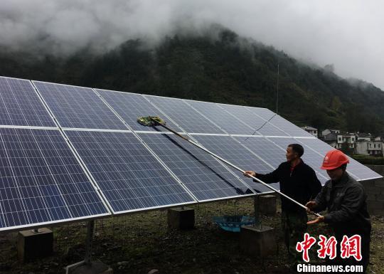 圖為村民正在打掃發(fā)電板上的灰塵、鳥(niǎo)糞等贓物?!≈芤恪z