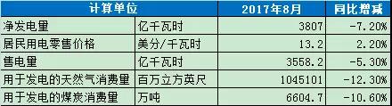 2017年8月,常規(guī)能源發(fā)電中火力發(fā)電量同比繼續(xù)回落,其中煤炭發(fā)電量為1200億千瓦時,同比下降11.6%,降幅擴(kuò)大6.6個百分點;天然氣發(fā)電量為1378億千瓦時,同比下降11.2%,降幅擴(kuò)大5.0個百分點;核能發(fā)電量724億千瓦時,同比增長1.2%,回落0.2個百分點;水力發(fā)電量214億千瓦時,同比增長16.0%;可再生能源發(fā)電量(除水電外)255億千瓦時,同比增長4.0%,其中風(fēng)力發(fā)電量同比下降3.4%,降幅收窄7.3個百分點;太陽能發(fā)電量同比增速為37.4%;地?zé)崮馨l(fā)電量同比增長3.4%;生物質(zhì)能發(fā)電量同比下降5.3%。