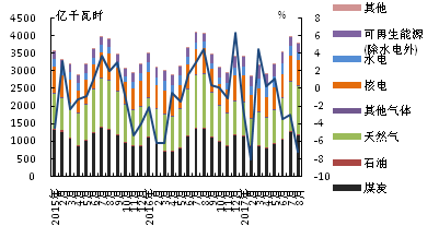 圖 1 2015年以來美國凈發(fā)電量增速與分品種構(gòu)成的逐月變化