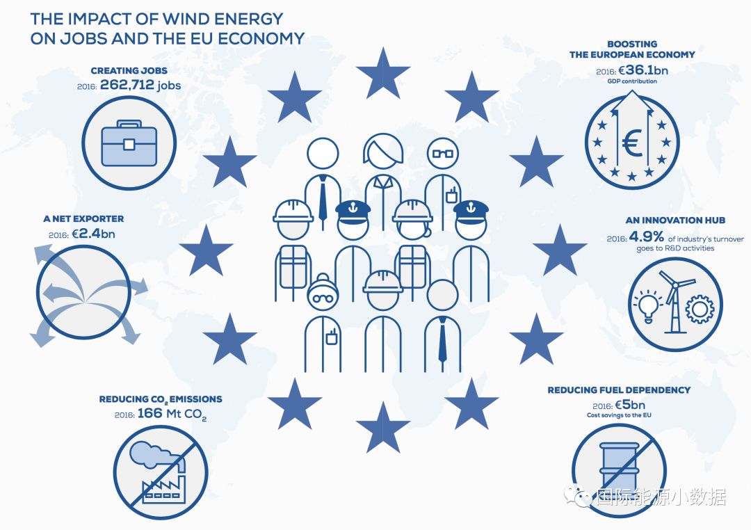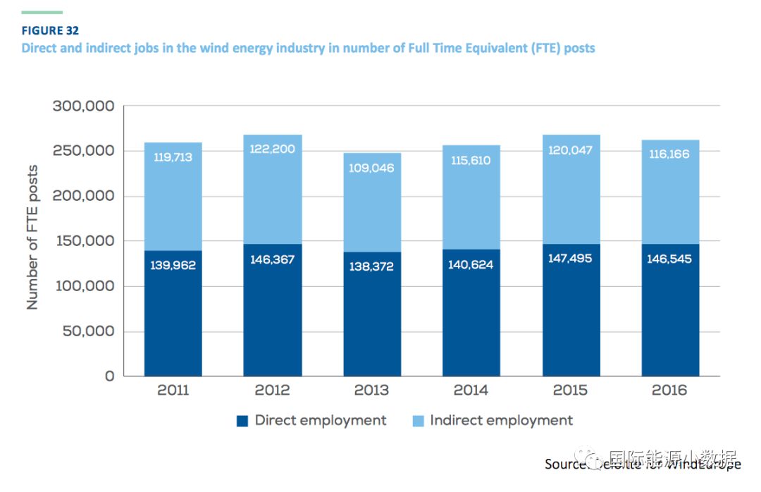 2016年到歐盟國家在風(fēng)電工業(yè)全職就業(yè)人數(shù)達(dá)到146,545人,其中有77,756人在風(fēng)機(jī)設(shè)備及零部件制造業(yè)(包括6628從事海上風(fēng)電設(shè)備制造);39,316人從事風(fēng)電技術(shù)服務(wù);21,824人從事風(fēng)電開發(fā)商工作。另外,風(fēng)電還在其他經(jīng)濟(jì)領(lǐng)域間接創(chuàng)造了116,166個(gè)就業(yè)機(jī)會(huì)。