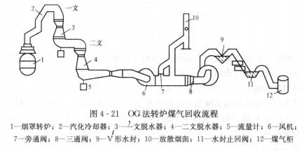 氣110~120rT13,所含熱量幾乎占到整個煉鋼過程放熱量的80%,其回收利用將有利于降低能源消耗。濕式除塵法是以雙級文氏管為主的煤氣回收流程(簡稱OG法),同時也是國內(nèi)發(fā)展較快且較為成熟的技術(shù),其工藝流程加圖4-21所示。