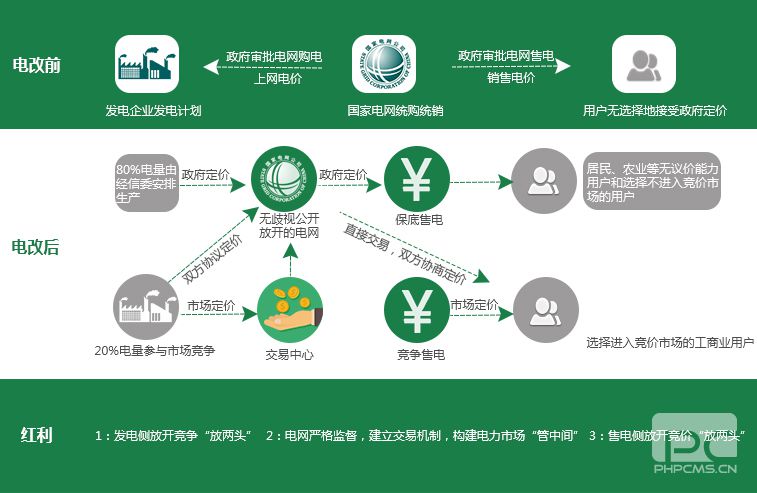 2015年3月25日,中共中央、國務(wù)院下發(fā)《關(guān)于進一步深化電力體制改革的若干意見》(中發(fā)[2015]9號),新一輪電力體制改革正式啟動。該文件主要介紹電改工作的主要性、總體思路、改革任務(wù)和相關(guān)的督促要求等。利用能源互聯(lián)網(wǎng)、移動互聯(lián)網(wǎng)和大數(shù)據(jù)技術(shù)改造能源電力行業(yè),能夠?qū)崿F(xiàn)橫向多元互補、縱向源-網(wǎng)-荷-儲(分布式能源、特高壓電網(wǎng)、客戶負(fù)荷管理、儲能用)協(xié)調(diào)、能源與信息高度融合的新型能源利用體系、電改前后電力行業(yè)變化如圖所示: