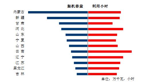 圖6 1-9月份風電裝機較多省份風電裝機容量和設備利用小時