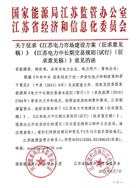國家能源局江蘇監(jiān)管辦、江蘇經(jīng)信委聯(lián)合發(fā)出關(guān)于征求《江蘇電力市場建設(shè)方案(征求意見稿)《江蘇電力中長期交易規(guī)則(試行)(征求意見稿)意見的函》,公開征求意見,詳情如下: