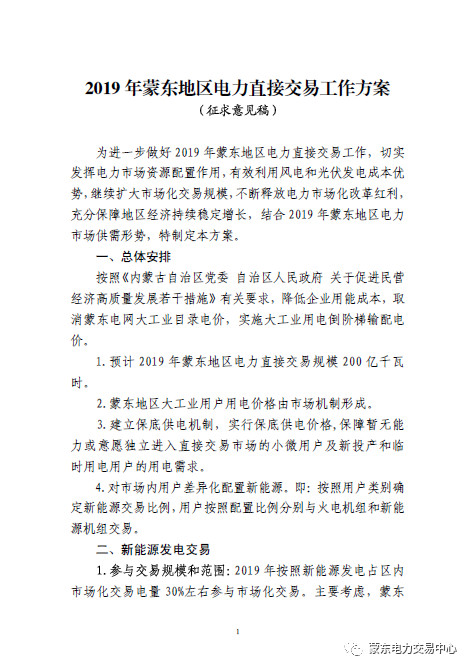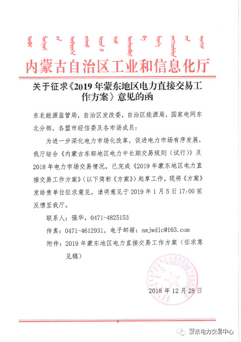 1.《內(nèi)蒙古自治區(qū)工信廳關(guān)于征求<2019年蒙東地區(qū)電力直接交易工作方案>意見的函》