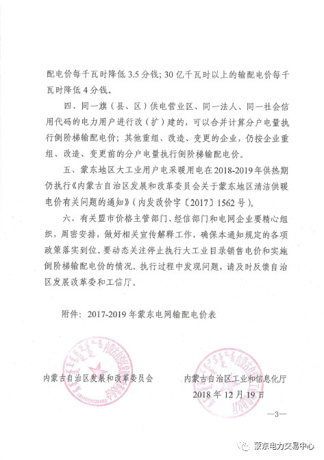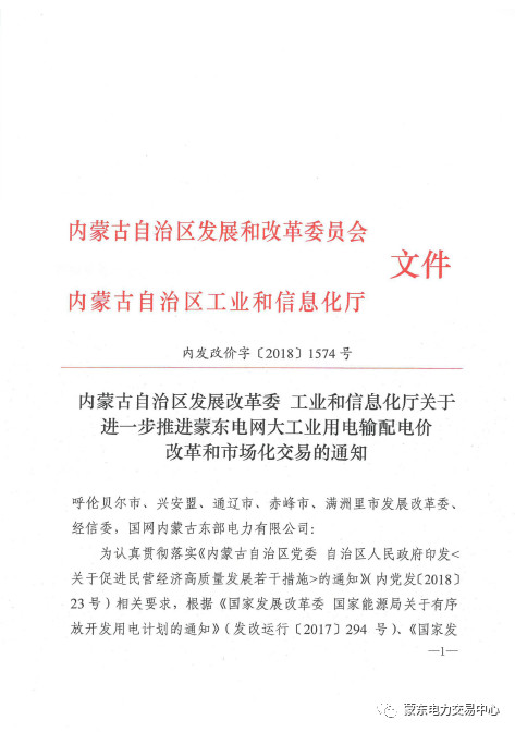 2.《內(nèi)蒙古自治區(qū)發(fā)展改革委 內(nèi)蒙古自治區(qū)工信廳關(guān)于進(jìn)一步推進(jìn)蒙東電網(wǎng)大工業(yè)用電輸配電價(jià)改革和市場化交易的通知》(內(nèi)發(fā)改價(jià)字〔2018〕1574號)