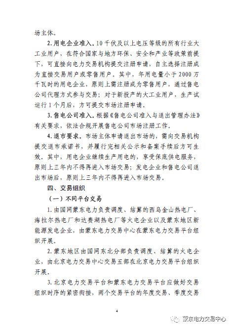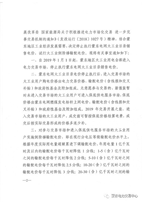 另《內(nèi)蒙古自治區(qū)發(fā)展改革委 內(nèi)蒙古自治區(qū)工信廳關(guān)于進(jìn)一步推進(jìn)蒙東電網(wǎng)大工業(yè)用電輸配電價(jià)改革和市場化交易的通知》規(guī)定自2019年1月1日起蒙東地區(qū)大工業(yè)用電全部進(jìn)入電力交易市場,停止執(zhí)行蒙東電網(wǎng)大工業(yè)目錄銷售電價(jià)。