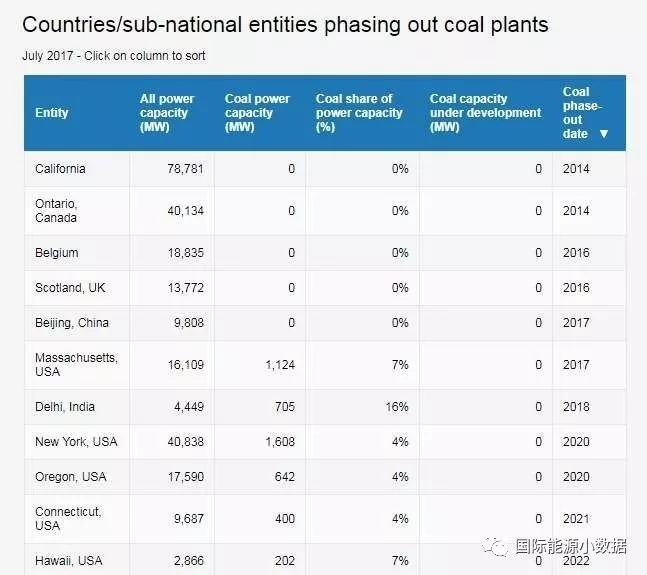 到2017年7月底為止,全球已經(jīng)有1個國家、4個地區(qū)(城市)完全放棄煤電:美國加利福尼亞州(2014)、加拿大安大略省(2014)、比利時(2016)、英國蘇格蘭(2016)、中國北京(2017)。此外,還有10個國家、8個地區(qū)(城市)宣布
