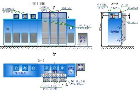 為保障變頻設備處于安全運行,避免環(huán)境溫度和粉塵對設備的不利影響,在變頻器功率柜側(cè)獨立增加密閉式強制冷卻系統(tǒng)。該系統(tǒng)作為變頻功率柜外的附屬裝置,能夠保證變頻功率柜始終處于25~40℃運行環(huán)境,大幅度延長濾網(wǎng)更換周期,少現(xiàn)場維護量。不需要為變頻器再獨立建筑房屋,變壓器柜采用開放式冷卻。強制冷卻裝置與變頻器功率柜一體化設計,附著于功率柜頂部。制冷壓縮機組安裝于變頻器柜附近。