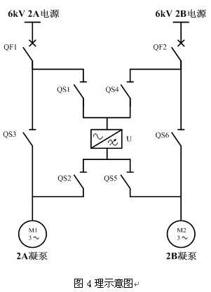基本原理:它是由六個高壓隔離開關(guān)QS1~QS6組成(見圖4)。其中QS1和QS4,QS2和QS5有電氣互鎖;QS3和QS2,QS6和QS5安裝機械互鎖裝置。如果兩路電源同時供電,A凝泵工作在變頻狀態(tài),B凝泵工作在工頻狀態(tài)時,QS3和QS4、QS5分閘,QS1、QS2和QS6處于合閘狀態(tài);B凝泵工作在變頻狀態(tài),A凝泵工作在工頻狀態(tài)時,QS1和QS2、QS6分閘,QS3、QS4和QS5處于合閘狀態(tài);如果檢修變頻器,QS3和QS6可以處于合閘狀態(tài),其它隔離開關(guān)都分閘,兩臺負載可以同時工頻運行;當一路電源檢修時,可以通過分合隔離開關(guān)使任一電機變頻運行。