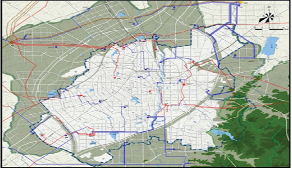 智能路徑選擇功能同時(shí)考慮電網(wǎng)自身設(shè)計(jì)要求和城市信息,實(shí)現(xiàn)推薦變電站出線的最優(yōu)路徑方案,需要數(shù)據(jù)有:變電站地理位置信息、輸電線路型號(hào)及載流量信息、架空線(電纜)及桿塔造價(jià)、城市總體規(guī)劃、城市控制性詳細(xì)規(guī)劃、路網(wǎng)圖、公共事業(yè)管線圖、路徑沿線建筑及綠植現(xiàn)狀信息等。公共事業(yè)管線分布如圖12所示。