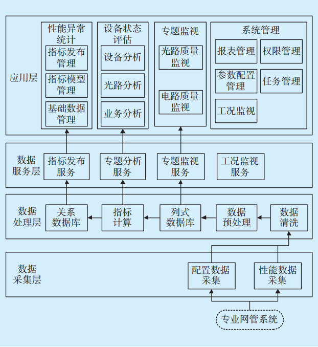 光傳輸設(shè)備網(wǎng)管系統(tǒng)包含豐富的數(shù)據(jù)資源,為了進(jìn)一步挖掘數(shù)據(jù)價(jià)值,準(zhǔn)確評(píng)估光傳輸設(shè)備的運(yùn)行狀態(tài)和健康程度,以便安排計(jì)劃?rùn)z修或技術(shù)改造,國(guó)網(wǎng)溫州供電公司開(kāi)展了基于專業(yè)網(wǎng)管系統(tǒng)的大數(shù)據(jù)分析研究,開(kāi)發(fā)了通信光傳輸設(shè)備狀態(tài)評(píng)價(jià)系統(tǒng)。該系統(tǒng)通過(guò)北向接口從光傳輸設(shè)備網(wǎng)管系統(tǒng)提取
