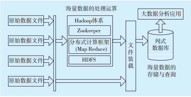 1)采用Hadoop體系進(jìn)行海量數(shù)據(jù)的處理運(yùn)算。海量數(shù)據(jù)的統(tǒng)計(jì)匯總,是大數(shù)據(jù)分析系統(tǒng)的基礎(chǔ)要求[3-5],而傳統(tǒng)的基于數(shù)據(jù)庫(kù)的數(shù)據(jù)運(yùn)算方式要求數(shù)據(jù)一次裝載后再進(jìn)行運(yùn)算,無(wú)法滿足對(duì)實(shí)時(shí)海量數(shù)據(jù)的匯總要求,且運(yùn)行成本高。將待運(yùn)算的海量數(shù)據(jù)實(shí)時(shí)加載到Hadoop平臺(tái),利用MapReduce框架進(jìn)行數(shù)據(jù)的統(tǒng)計(jì)、匯總及特征值等運(yùn)算,可滿足大數(shù)據(jù)量、高實(shí)時(shí)性的運(yùn)算要求。