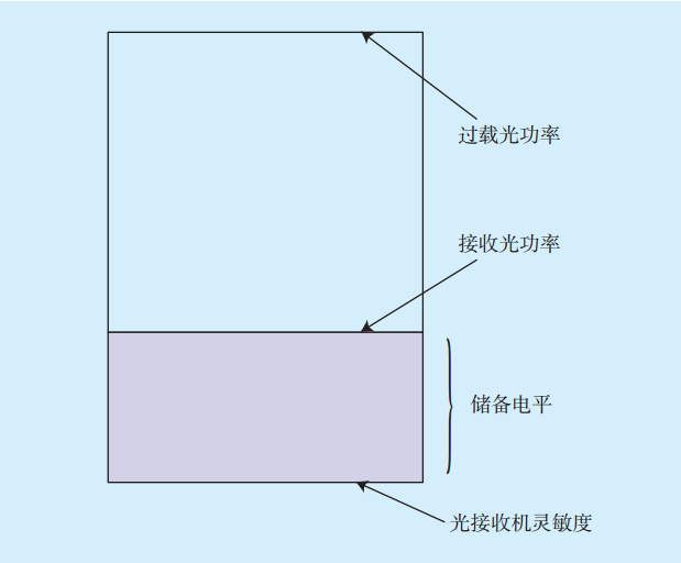 1)儲(chǔ)備電平。光接口實(shí)際收光功率不能高于過(guò)載光功率,也不能低于接收機(jī)靈敏度,否則該光路失效,不能正常通信。在設(shè)備投運(yùn)之初,收光功率基本都能滿足以上條件,隨著運(yùn)行年限的增加,設(shè)備逐步老化,光纜性能也逐步劣化,收光功率會(huì)慢慢降低。當(dāng)收光功率降低到接收機(jī)靈敏度及以下時(shí),通信誤碼會(huì)增多以致通信中斷。因此,本文提出了儲(chǔ)備電平的概念,儲(chǔ)備電平就是實(shí)際收光功率減去光接收機(jī)靈敏度。儲(chǔ)備電平可反映光傳輸設(shè)備光路的健康程度,因此有必要對(duì)儲(chǔ)備電平進(jìn)行實(shí)時(shí)監(jiān)控,當(dāng)儲(chǔ)備電平值降低到一定區(qū)間時(shí)給出預(yù)警提示。儲(chǔ)備電平概念圖如圖3所示。