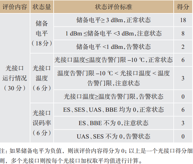 根據(jù)以上3個(gè)指標(biāo),光接口狀態(tài)評(píng)價(jià)標(biāo)準(zhǔn)及評(píng)分細(xì)則見(jiàn)表1所列。
