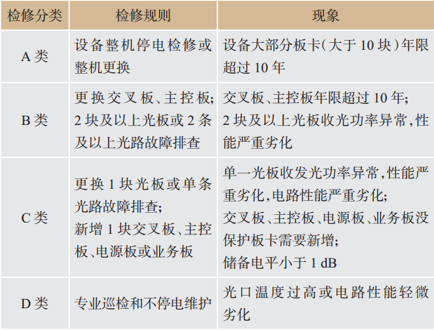 根據(jù)以上設(shè)備評(píng)分標(biāo)準(zhǔn),分3檔對(duì)設(shè)備進(jìn)行狀態(tài)區(qū)分:得分≤80分為“異常”,80分<得分≤90分為“注意”,得分>90分為“正常”。然后再根據(jù)設(shè)備現(xiàn)象安排不同級(jí)別檢修,根據(jù)檢修的影響程度分為“A類檢修”、“B類檢修”、“C類檢修”、“D類檢修”。檢修分類規(guī)則及現(xiàn)象描述見(jiàn)表5所列。
