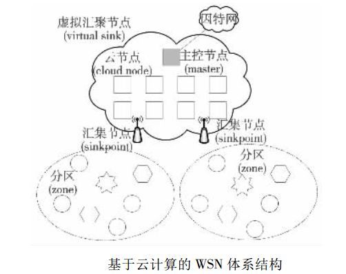 基于云計算的無線傳感網(wǎng)體系結(jié)構(gòu)如圖所示。一組特殊節(jié)點分布于無線傳感網(wǎng)(WSN)區(qū)域,稱為云節(jié)點。云節(jié)點具有比傳感器更豐富的資源,有兩個功能。一方面,這些節(jié)點組成云, 是云的一部分; 另一方面,它們還可與傳感器進行通信,收集附件傳感器的數(shù)據(jù), 也稱為匯聚觸點( point sink) 。傳感器將感知數(shù)據(jù)發(fā)送到某一個匯聚觸點( 以多跳方式) , 匯聚點再將數(shù)據(jù)存儲到云中。把數(shù)據(jù)發(fā)往同一個匯聚觸點的傳感器組成一個組,為了與 WSN中簇的概念相區(qū)分, 這種組為分區(qū)( zone) 。對傳感器而言,整個云表現(xiàn)為一個虛擬匯聚節(jié)點( virtual sink) 。