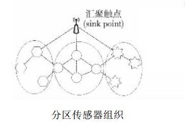 傳感器按照某種規(guī)則歸屬于一個分區(qū)。例如,傳感器可以加入到距離最近的匯聚觸點所代表的分區(qū)。每個分區(qū)中的傳感器可以是相同類型或不同類型, 它們構(gòu)成本地無線傳感網(wǎng),且獨立于其他分區(qū)。所有本地無線傳感網(wǎng)通過云連接成一個整體。分區(qū)中傳感器可以采用平面結(jié)構(gòu)或?qū)哟谓Y(jié)構(gòu)進行組織。
