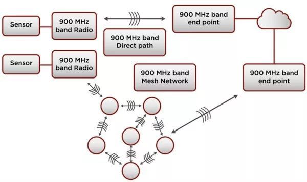 上文提到過的網(wǎng)狀網(wǎng)絡也使用這些頻段,該網(wǎng)絡由許多小型低功耗的無線設備組成,這些無線設備彼此高度相連,可將來自邊緣區(qū)域的傳感器數(shù)據(jù)匯集到一個集合點,而這些集合點都與云端相連。這樣就保證了無線網(wǎng)絡的覆蓋范圍。