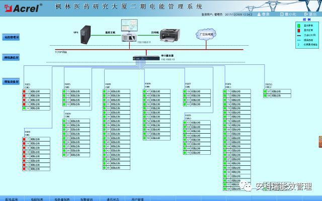 楓林醫(yī)藥研究大廈二期,采用智能電力儀表、采集配電現(xiàn)場(chǎng)的各種電參量。系統(tǒng)采用現(xiàn)場(chǎng)就地組網(wǎng)的方式,組網(wǎng)后通過(guò)現(xiàn)場(chǎng)總線通訊并遠(yuǎn)傳至后臺(tái),通過(guò)Acrel-3000型電能管理系統(tǒng)實(shí)現(xiàn)樓層配電回路用電的實(shí)時(shí)監(jiān)控和管理。