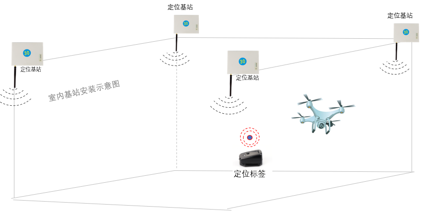 在需要定位的區(qū)域安裝一定數(shù)量的定位基站讓定位基站信號(hào)覆蓋需要定位的區(qū)域,無人機(jī)攜帶定位標(biāo)簽就可實(shí)現(xiàn)對(duì)目標(biāo)對(duì)象的分米級(jí)精確定位。